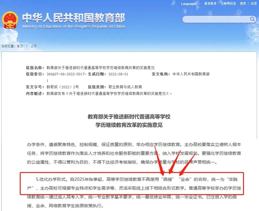自2025年秋季起,成人高等學歷繼續教育不再使用“函授”“業余”的名稱,統一為“非脫產”。